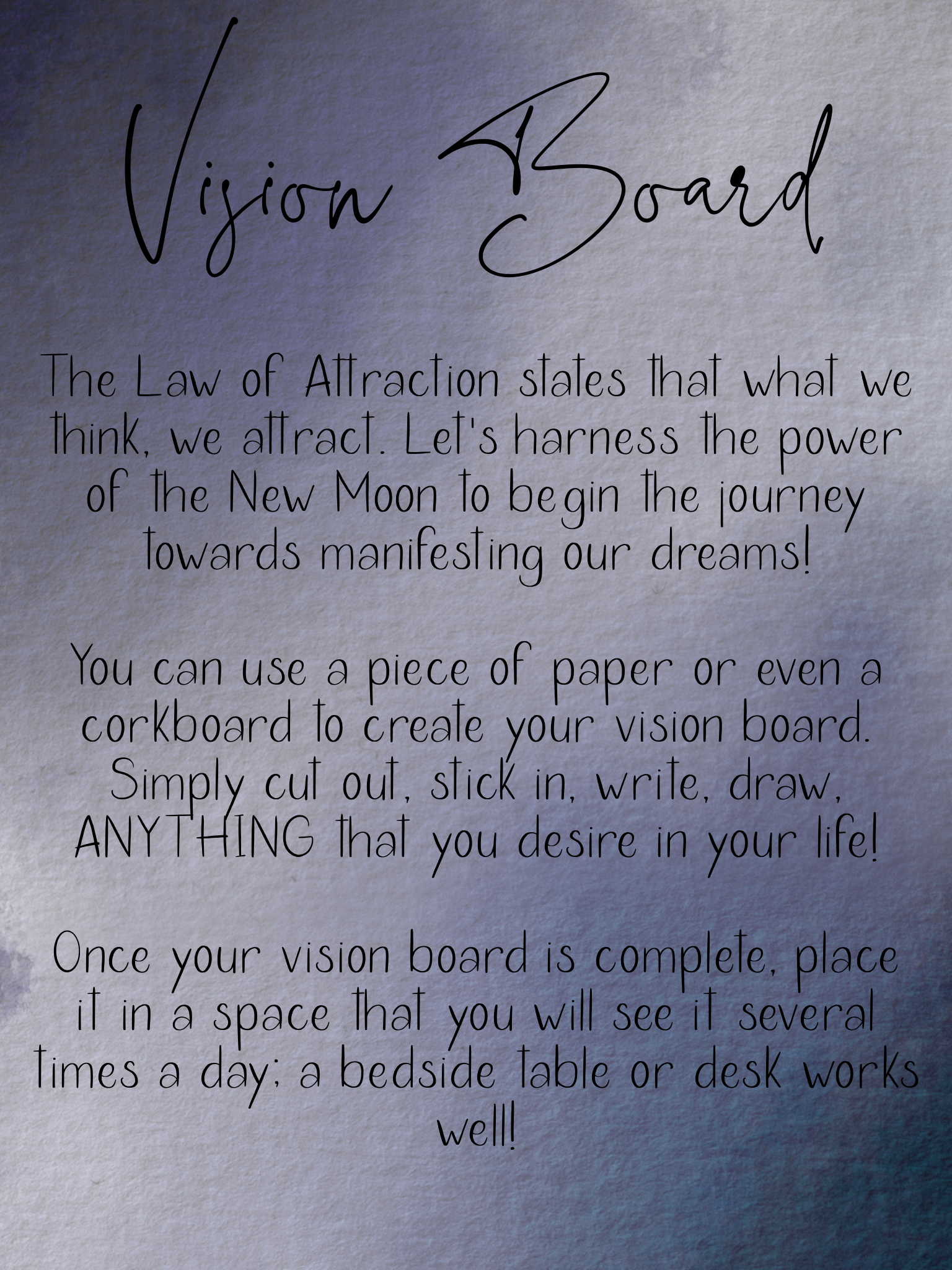 A perfect pairing with the New Moon energy is creating a vision board! Taking the first step towards your dreams and manifesting your hearts desires; a simple spell but a vital one when working with intentions and manifesting.